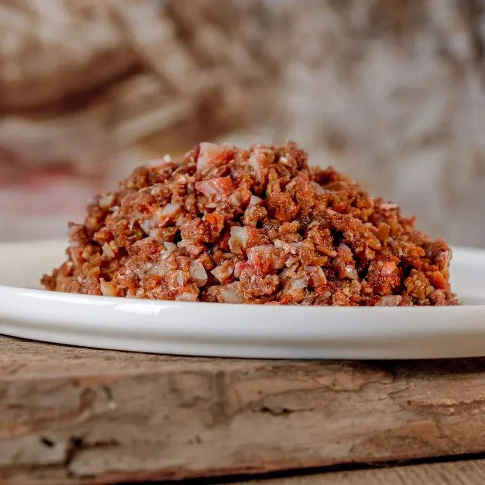 Fein gewolftes Rindfleisch, nährstoffreiche Innereien sowie ausgewähltes Gemüse ergeben ein ausgewogenes BARF-Komplett-Menü für Hunde. Die Kombination liefert hochwertige Proteine, Vitamine und Mineralstoffe und eignet sich ideal für den BARF-Alltag. Ein vollwertiges Menü für aktive Vierbeiner, die eine kräftige und natürliche BARF-Mahlzeit benötigen.