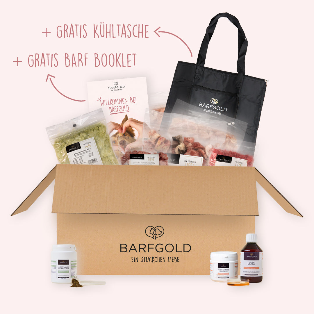 Beginne mit unseren sorgfältig zusammengestellten Starterpaketen den Einstieg ins BARFen – inklusive einer kostenlosen Kühltasche und eines Booklets!
