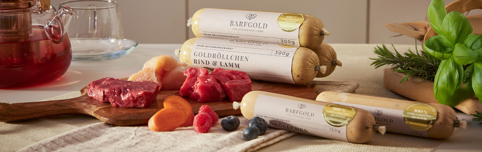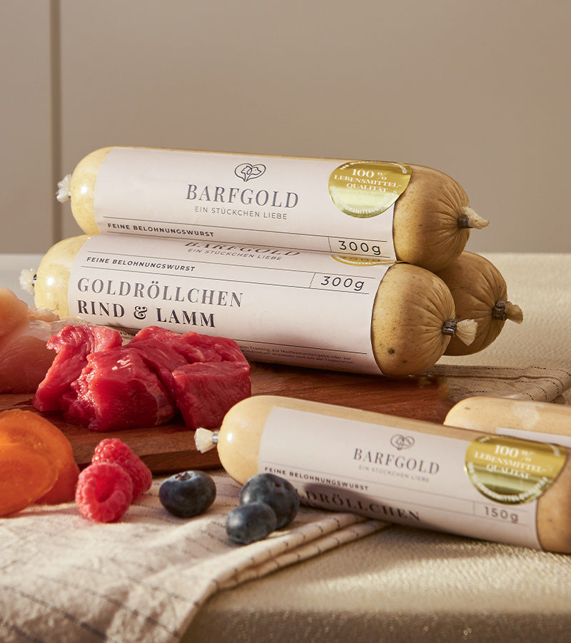 Zwei Varianten, die Genuss und Qualität vereinen. Ob Rind & Lamm mit feiner Karotte oder Huhn mit aromatischen Waldfrüchten – jede Goldröllchen-Variante steht für natürliche Zutaten, hohen Fleischanteil und beste BARFGOLD-Qualität. Ideal als natürlicher Hundesnack, fürs Training oder zum Belohnen.