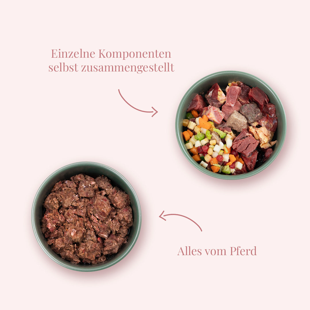 2 x 1000 g Alles vom Pferd: Eine Mischung aus verschiedenen Bestandteilen vom Pferd (Fleisch, Innereien, Knochen), die eine abwechslungsreiche und vollwertige Ernährung sicherstellt.