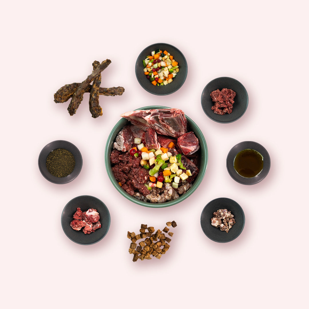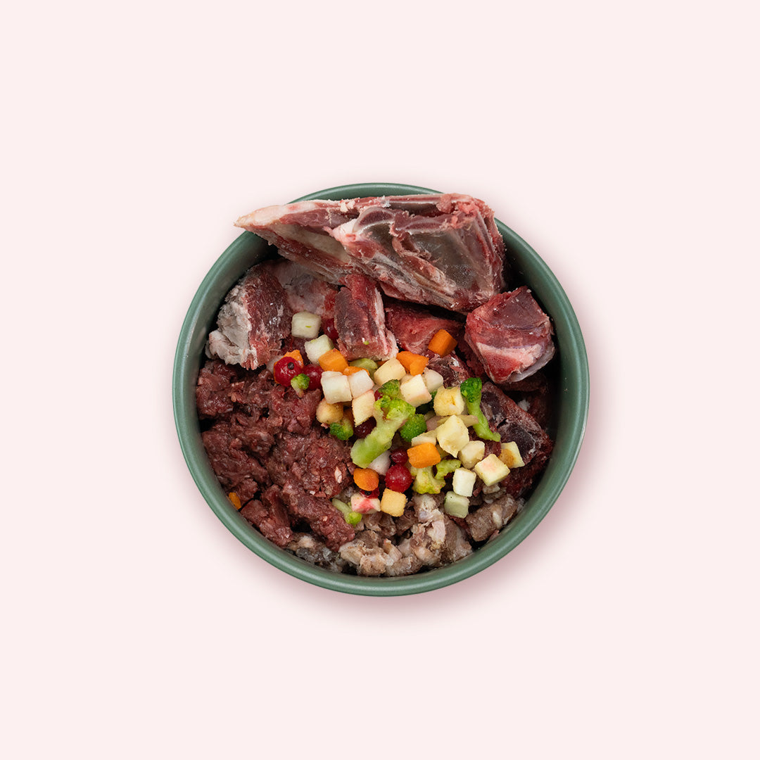 Abwechslungsreiche Ernährung: Neben hochwertigen Fleischsorten in gewolfter sowie stückiger Form bietet das Starterpaket auch gesunde Knochen, Gemüse und Früchte, die das BARF-Menü ideal ergänzen und für eine ausgewogene Ernährung sorgen.